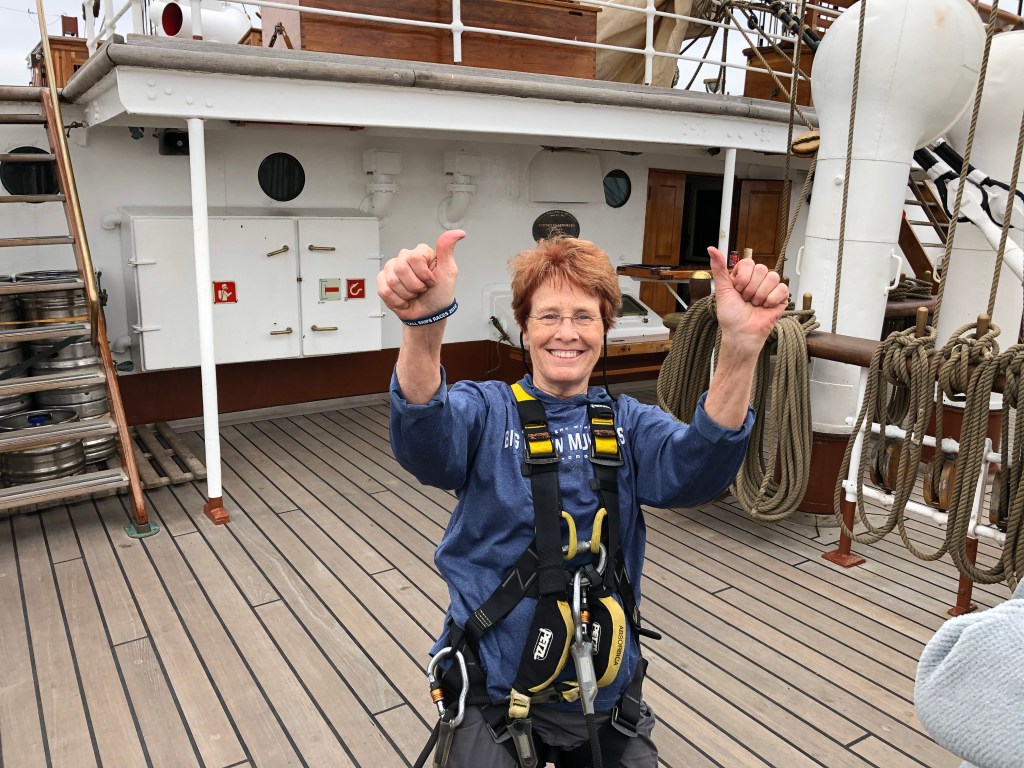 Jim and I both love to travel and have visited Steve/Rufus in New York several times. In 2019, we joined him, his son Grant, Katie and her daughter, Gerry Del Hagen and his wife and daughter, Jim Johnson and Lily in Norway to sail on the Statsraad Lehmkuhl for a week. I never thought I would see the ship again, sail on her, and climb the rigging. It was amazing! We did the watch assignments and some ship work but slept in hammocks. The hammocks were actually fairly comfortable.